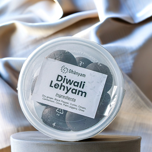 The process of making Diwali lehyam is as enriching as its consumption. The ingredients are carefully measured, ground into a fine powder, and then cooked in ghee until they form a thick, aromatic paste. Palm jaggery is then added to sweeten the mixture naturally. The result is a lehyam that is not just a medicinal preparation but also a delicious treat, enjoyed by adults and children alike.