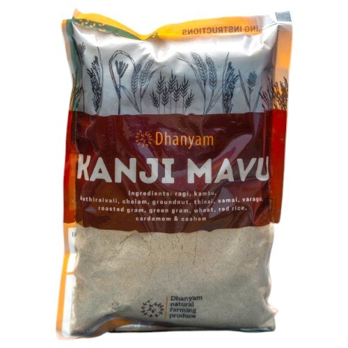 The unique recipe of our kanji mavu includes an impressive array of ingredients: ragi (finger millet), kambu (pearl millet), jowar (sorghum), thinai (foxtail millet), samai (little millet), varagu (kodo millet), red rice, roasted green gram, groundnut, wheat, cashews, and cardamom.