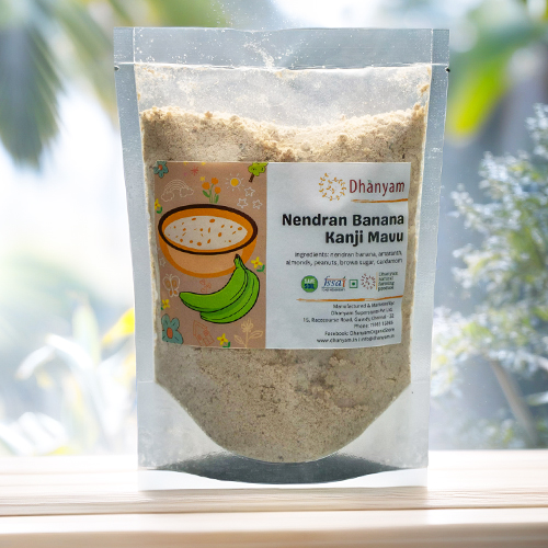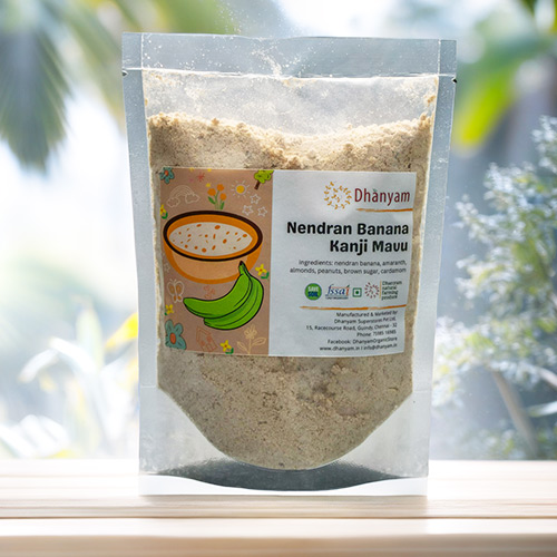 What sets Dhanyams’ Organic Nendran Banana Kanji Mavu apart is its commitment to quality and authenticity. Manufactured in-house using organic ingredients, the blend is crafted with the utmost care and attention to detail, ensuring that every spoonful delivers the nourishment and satisfaction of a truly organic and wholesome blend. Each component is carefully measured and combined to create a harmonious blend that captures the essence of traditional Indian cuisine while incorporating modern nutritional principles.