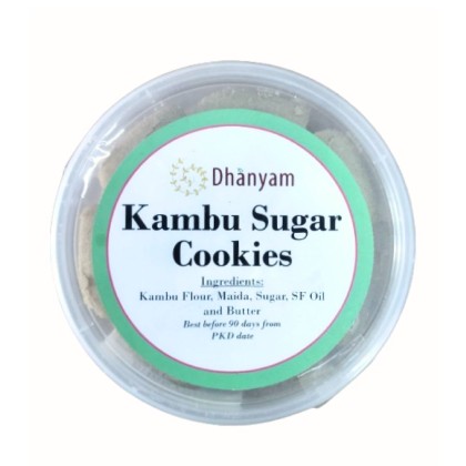 Dhanyam’s Organic Kambu Sugar Cookies are a delightful fusion of traditional ingredients and modern baking techniques, offering a wholesome and flavorful treat. Crafted with care from organic kambu (pearl millet), maida (refined wheat flour), sugar, sunflower oil, and butter, these cookies embody the rich heritage of nutritious millets and the comforting sweetness of homemade cookies.