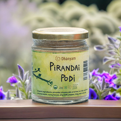 Dhanyam takes immense pleasure in presenting our Organic Pirandai Podi, a carefully crafted blend of organic ingredients that embodies the essence of traditional South Indian cuisine. Manufactured in-house at Sattva Kitchen, our podi is a harmonious fusion of flavors and textures, combining the unique taste of pirandai (veldt grape) with a medley of aromatic spices and pulses. Each ingredient, sourced from certified organic farms, is meticulously selected to ensure the highest quality and purity.