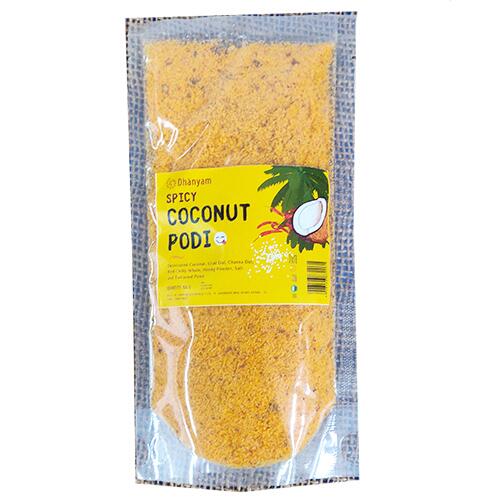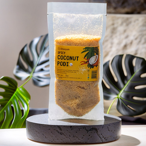 The key ingredients in Dhanyam’s Organic Spicy Coconut Podi include desiccated coconut, urad dal, channa dal, whole red chilies, heeng powder, Himalayan rock salt, and tamarind paste. Each ingredient is chosen for its superior quality and nutritional benefits. The desiccated coconut provides a rich, creamy texture and a burst of natural sweetness, while the dals add a hearty crunch and a boost of protein. The combination of red chilies and heeng powder infuses the podi with a spicy, aromatic kick, and the Himalayan rock salt and tamarind paste balance the flavors perfectly, offering a tangy, savory finish.