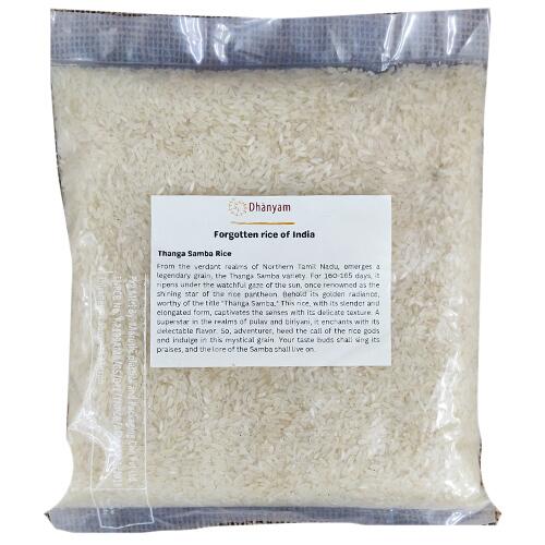Dhanyam proudly presents its Organic Thanga Samba Rice, a treasure in South Indian cuisine renowned for its golden hue and exceptional quality. The name "Thanga Samba" derives from the Tamil word "Thangam," meaning "gold," which perfectly describes the mature grains’ lustrous golden color. This rice variety is highly prized for its fine, elongated grains, making it ideal for special dishes like pulav, biryani, and other culinary delicacies. With its exquisite texture and delicate aroma, Thanga Samba Rice adds a touch of luxury to any South Indian meal, elevating it to a culinary experience to be savored and remembered.